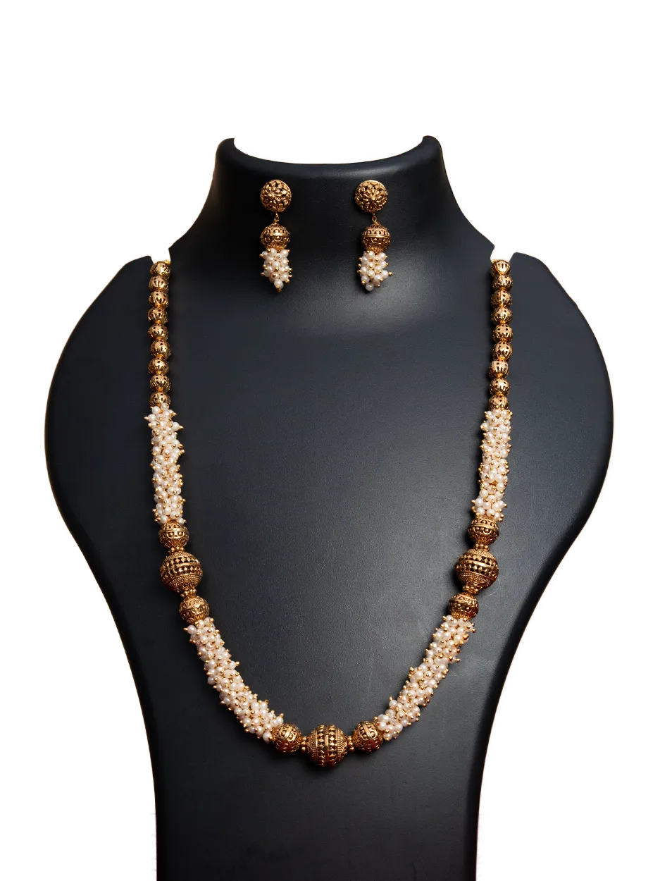 This Antique Gold Bead & Pearl Mala Necklace Set is a graceful piece designed for those who love classic temple-inspired jewellery. The necklace is crafted with alternating antique-finish gold beads and strands of tiny clustered pearls, creating a balanced and elegant look. The design is complemented by matching jhumka-style earrings with pearl drops, adding charm to every movement. Lightweight yet regal, this mala is versatile for traditional occasions, festive functions, and temple visits. Its long style makes it perfect for layering with chokers or heavy bridal sets, making it a must-have addition to your ethnic collection.