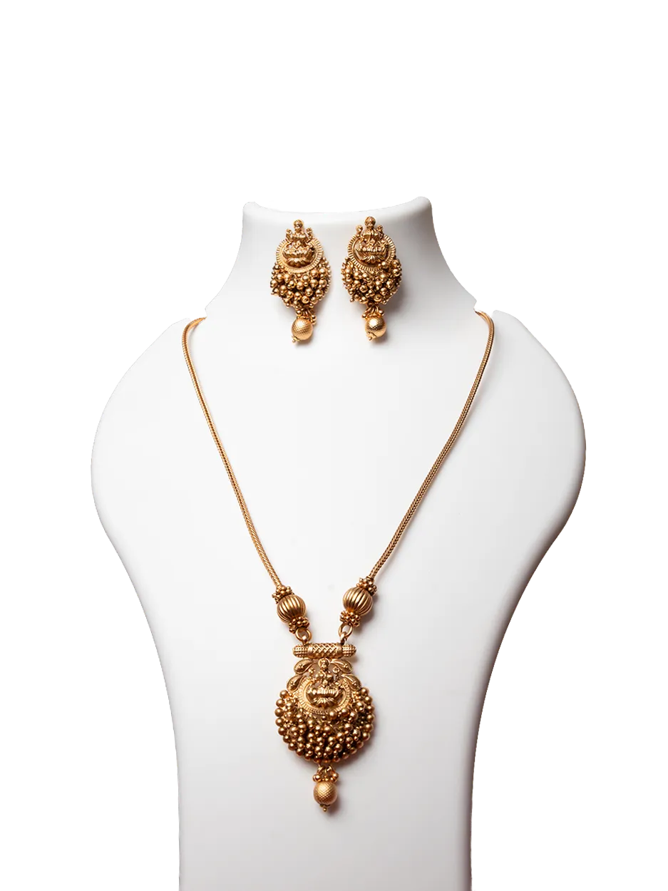 This Antique Gold Temple Goddess Long Necklace Set is a stunning example of classic temple jewellery artistry. The long chain holds a beautifully detailed pendant depicting a goddess, surrounded by intricate bead clusters that add richness and texture. The pendant is complemented by matching statement earrings with similar temple motifs, ensuring a graceful and majestic look. Crafted in an antique gold finish, this set is perfect for weddings, festive events, temple ceremonies, or traditional dance performances. Pair it with sarees, lehengas, or ethnic gowns to complete a regal ensemble.