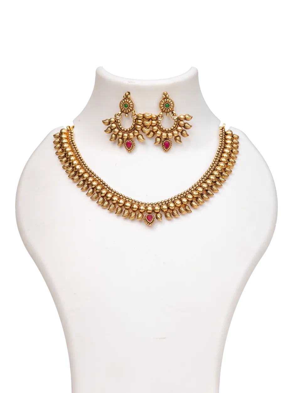 Celebrate timeless South Indian craftsmanship with this beautifully designed antique temple necklace set. The necklace showcases a graceful arrangement of polished gold-tone beads bordered by finely detailed leaf motifs, creating a rich and heritage-inspired silhouette. A ruby-colored teardrop stone at the center adds a subtle yet striking focal point, enhancing the regal appeal of the piece.