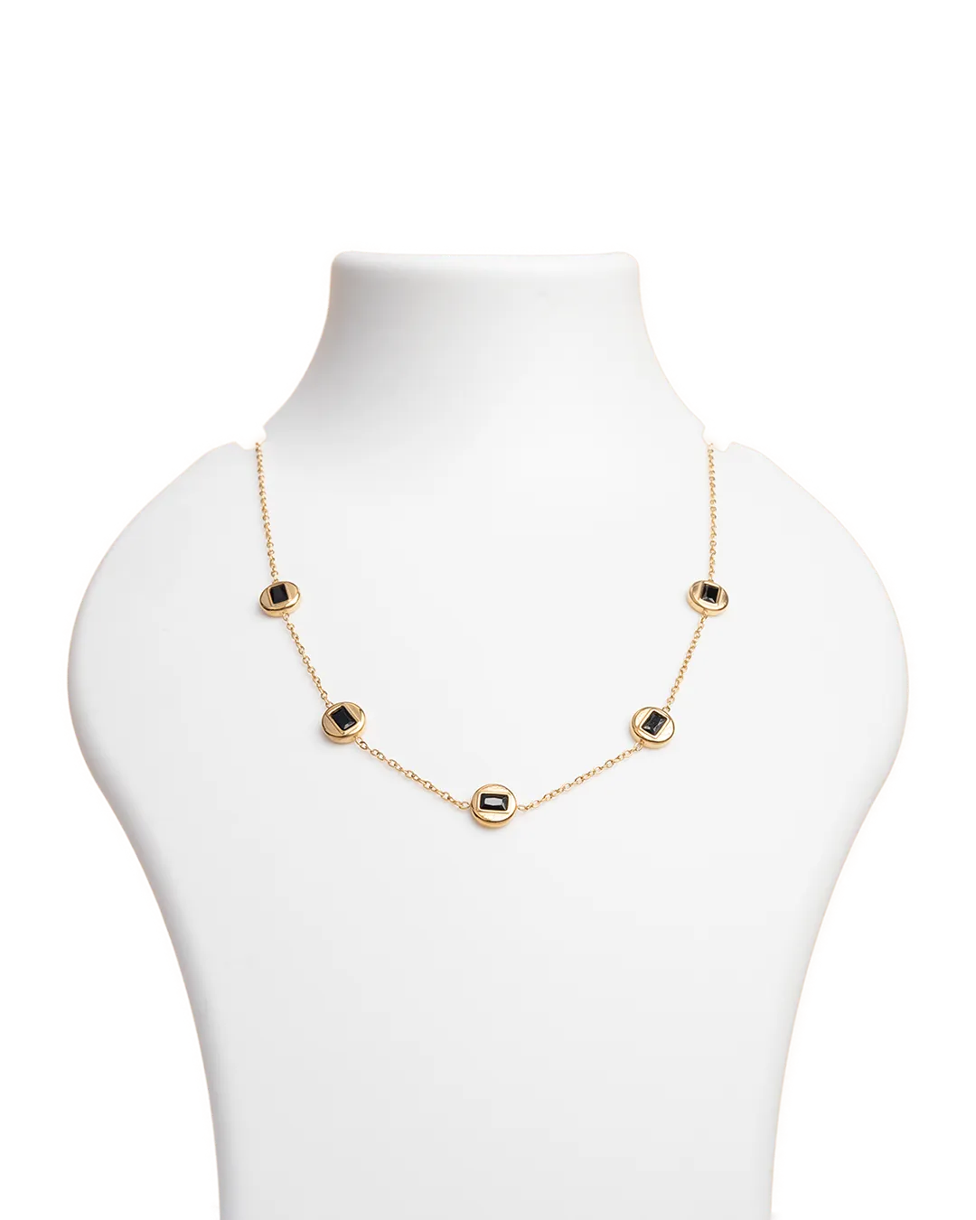 This Ava Necklace is the perfect blend of simple elegance and practical design. Its lightweight, gold-toned chain holds a single, polished black stone, securely held in place by a sleek bezel setting. The striking contrast between the radiant gold and the deep, mysterious black stone adds a sophisticated and modern touch to any outfit.