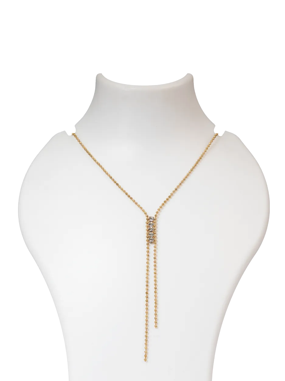 Elevate your style with the  Cascade Y Necklace, a modern and chic accessory crafted to enhance your neckline. Designed in a flattering Y-shape, this necklace features shimmering stone accents at the center with elegant cascading chains that add graceful movement.
