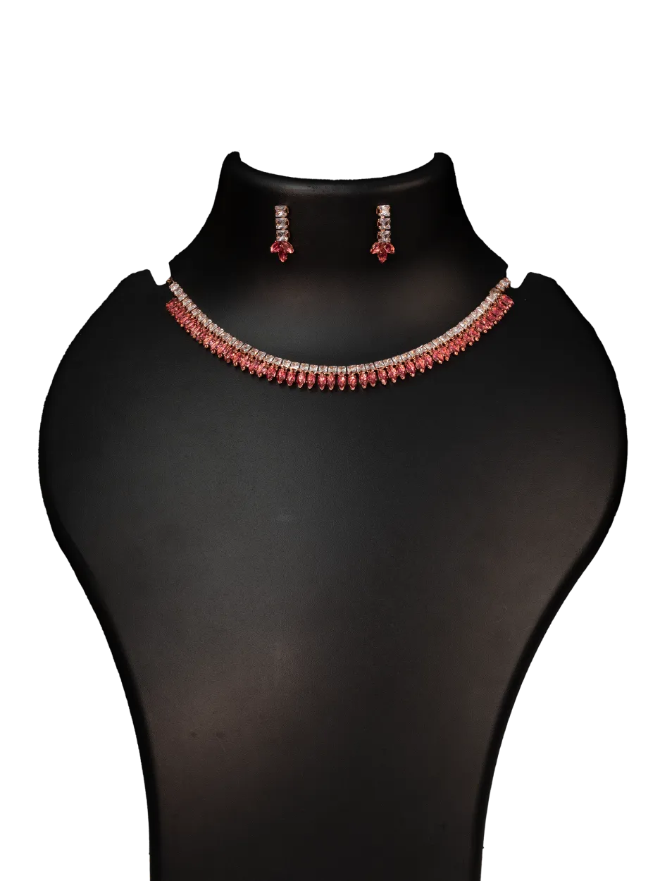 The design is enhanced with beautifully arranged marquise-shaped stones that add texture, brilliance, and a sophisticated finish without overpowering the look. Its short necklace style makes it perfect for highlighting the neckline while remaining lightweight and comfortable for extended wear.