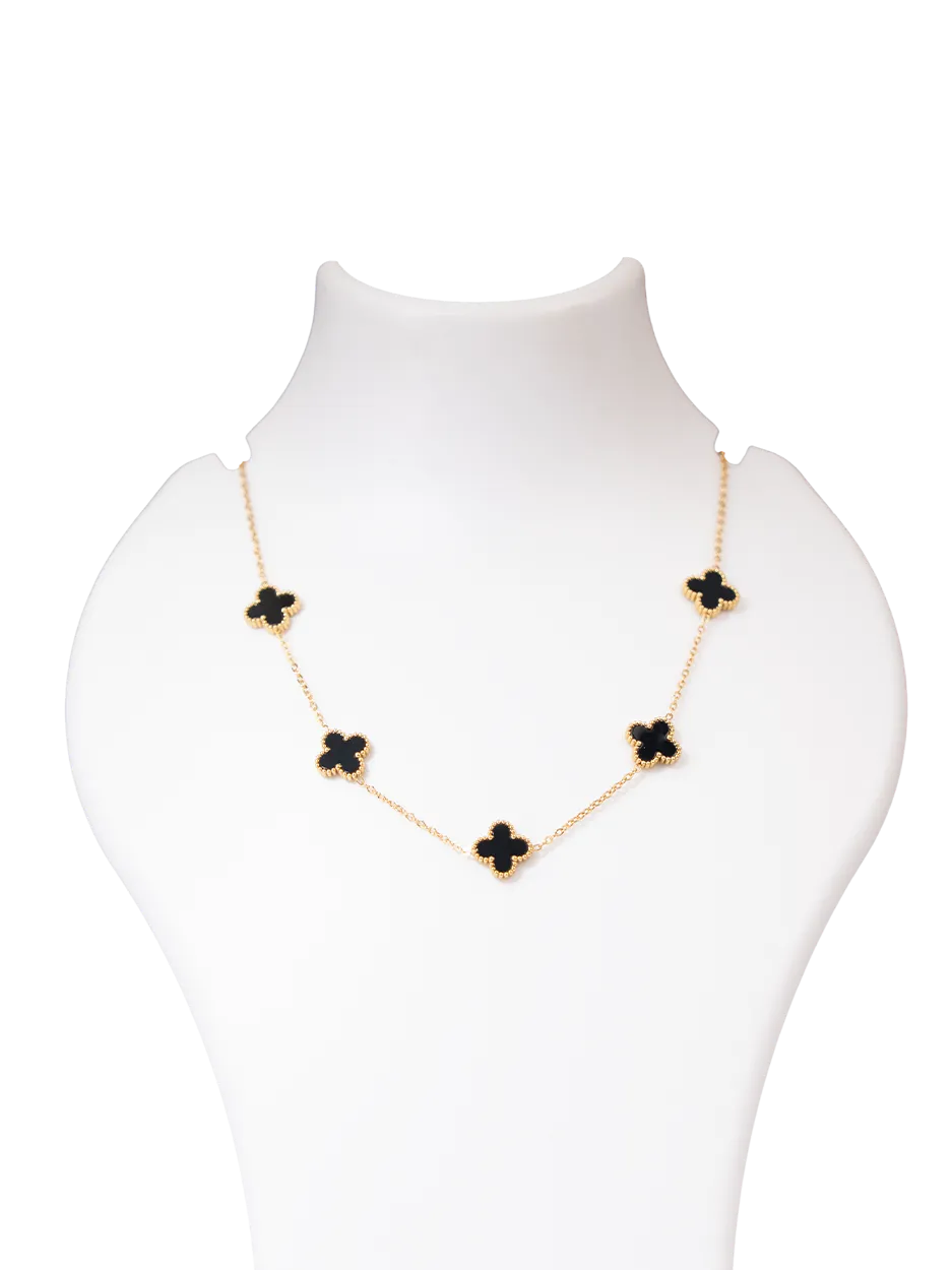 The Clover Luxe Necklace blends modern refinement with symbolic beauty. Featuring evenly spaced black/white clover charms framed in gold detailing, this piece brings a touch of understated luxury to your jewellery collection.