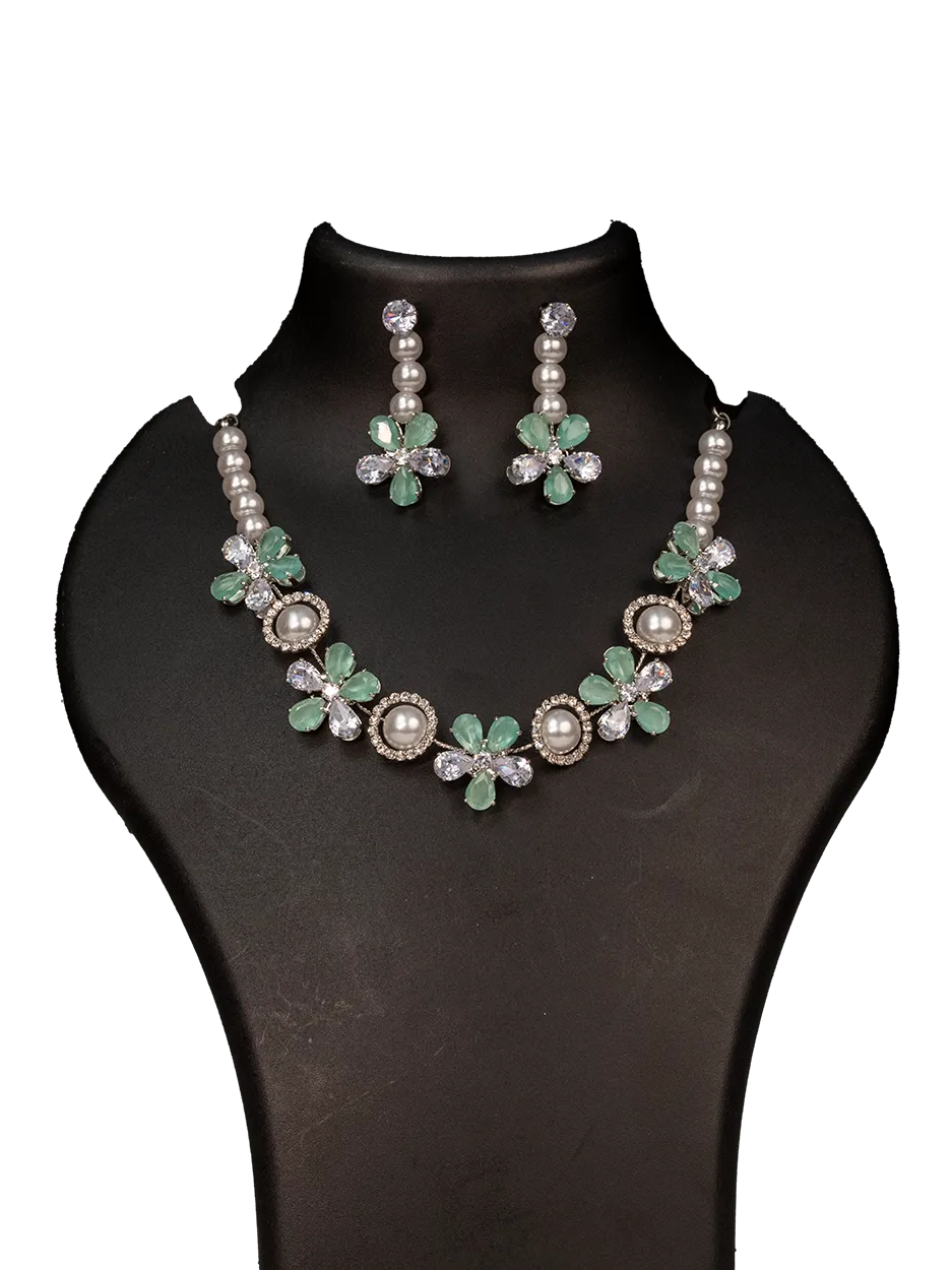 Ideal for receptions, weddings, festive occasions, and evening events, this Floral Mint Green Stone Pearl Necklace Set is a charming addition to any jewelry collection.