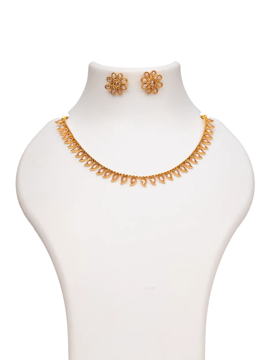 The matching floral stud earrings complement the necklace with a charming petal arrangement, offering a balanced and cohesive look. Lightweight and comfortable, this set is ideal for daily wear, festive gatherings, or intimate celebrations.