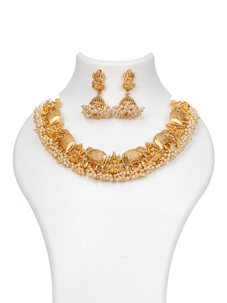This exquisite temple-inspired necklace set is a masterpiece of traditional Indian craftsmanship. Designed with detailed elephant motifs symbolizing strength, prosperity, and royal heritage, the necklace is adorned with fine pearl embellishments that add a touch of elegance and luxury.