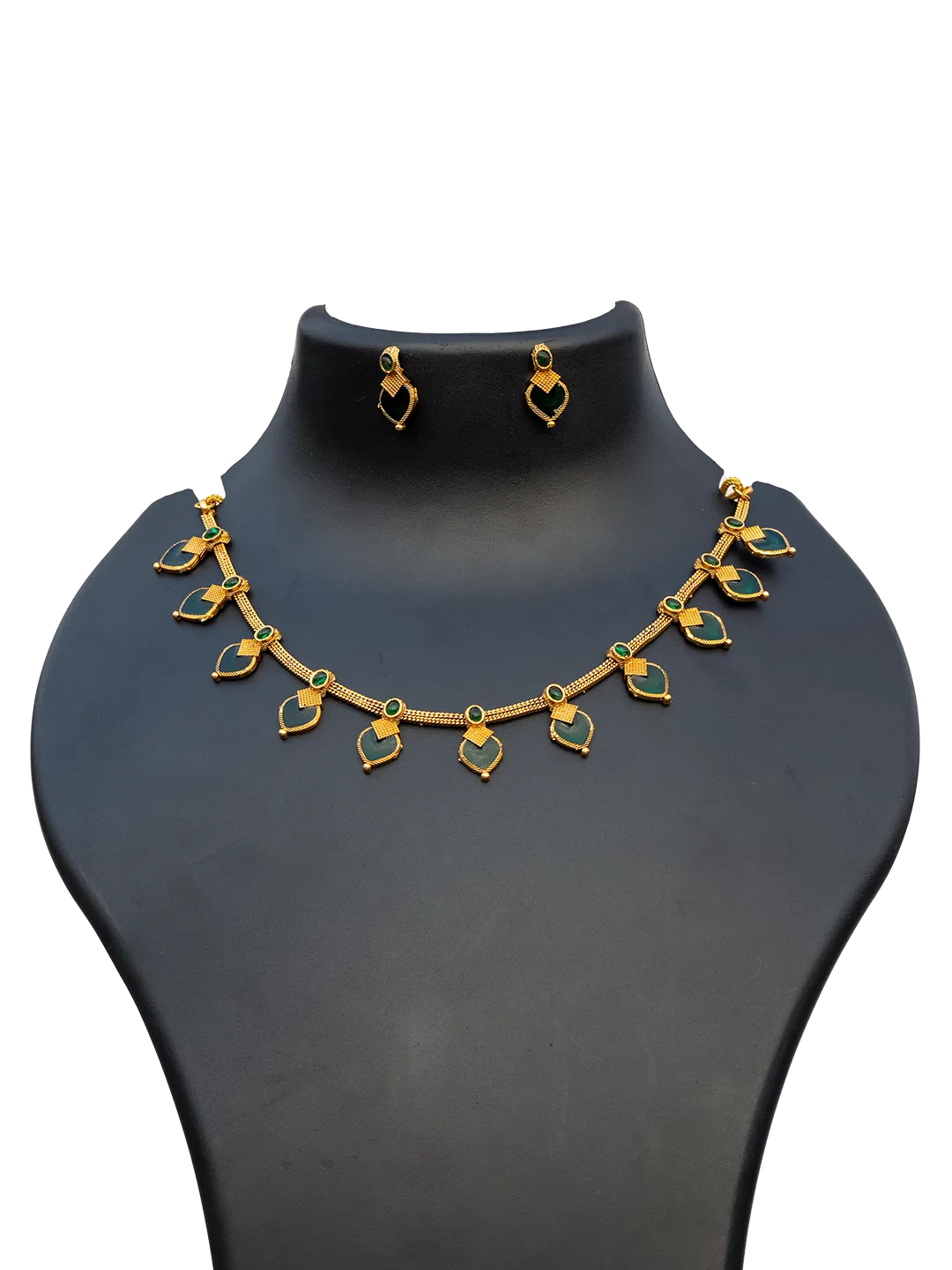 Deeply rooted in the cultural artistry of Kerala, this set is a tribute to heritage and nature. The necklace features a series of meticulously crafted leaf-shaped Palakka charms, each glowing with a rich, translucent green hue that mimics the lush beauty of an emerald. These motifs are securely set within a high-quality gold-toned frame, accented with delicate textured metalwork that adds a touch of vintage royalty.