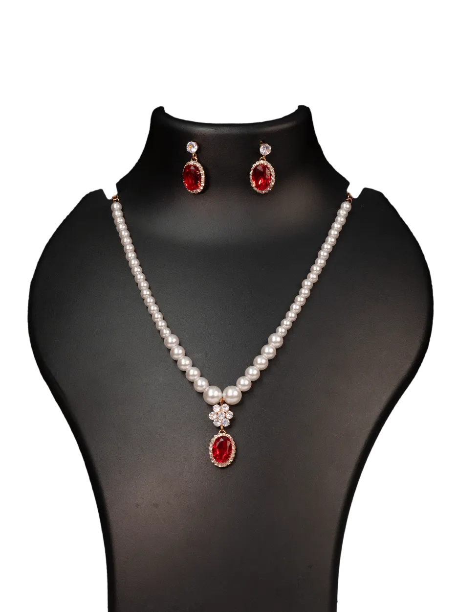At the center, a delicate floral accent embellished with sparkling stones leads to a striking Red/Green/Blue stone drop pendant, adding richness and visual elegance to the design. The deep red stone creates a beautiful contrast against the soft pearls, enhancing the overall charm of the necklace.