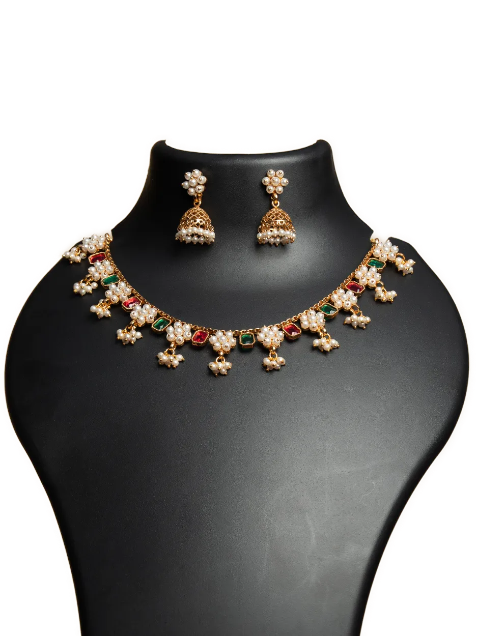 A light weight choker with pearl clusters, red and green kundan accents, and matching pearl jhumkas for an elegant festive look.