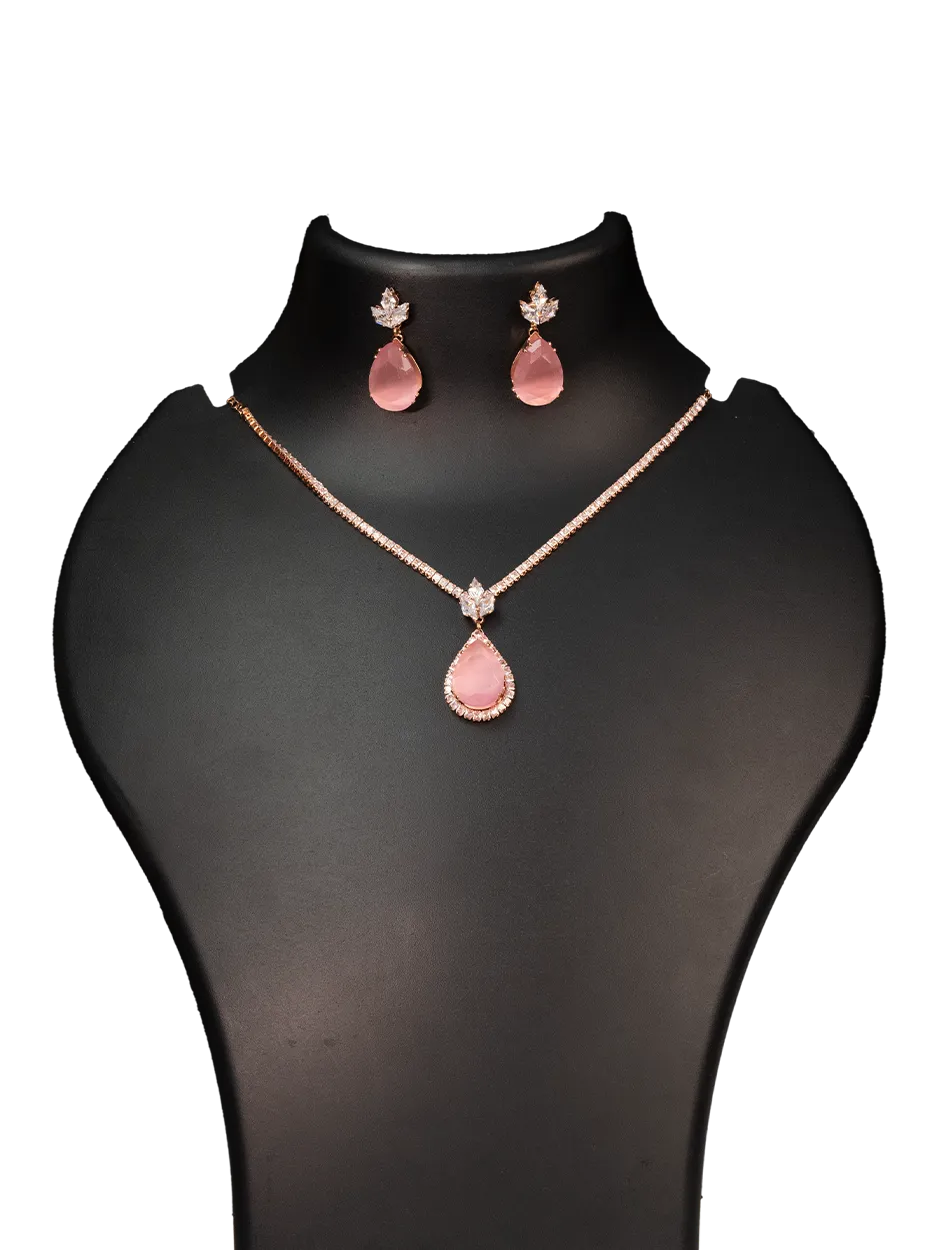 The centerpiece features a beautifully cut teardrop-shaped rose-colored/green stone, delicately framed with white crystal accents that enhance its gentle glow. The drop-style pendant adds subtle movement and sophistication, making it suitable for both daytime elegance and evening wear.