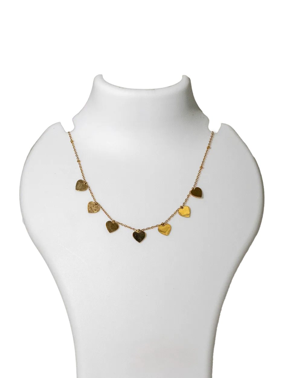 Express your style with love using The Dainty Heart Charm Necklace. This elegant gold-tone necklace for women features a collection of beautifully polished and textured heart charms suspended from a fine, delicate chain. The short length sits beautifully near the collarbone, making it an ideal piece for layering or wearing on its own as a statement of minimalist charm.