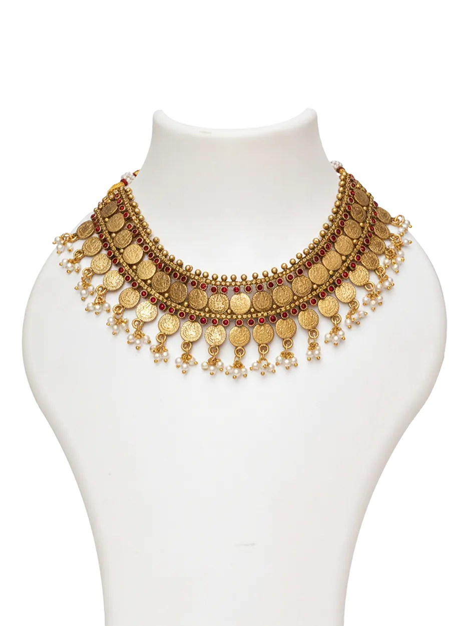 The design features finely crafted antique gold-finish coin motifs arranged in layered rows, enhanced with subtle red stone detailing along the borders. Delicate pearl hangings add graceful movement and a touch of softness, elevating the overall traditional charm.