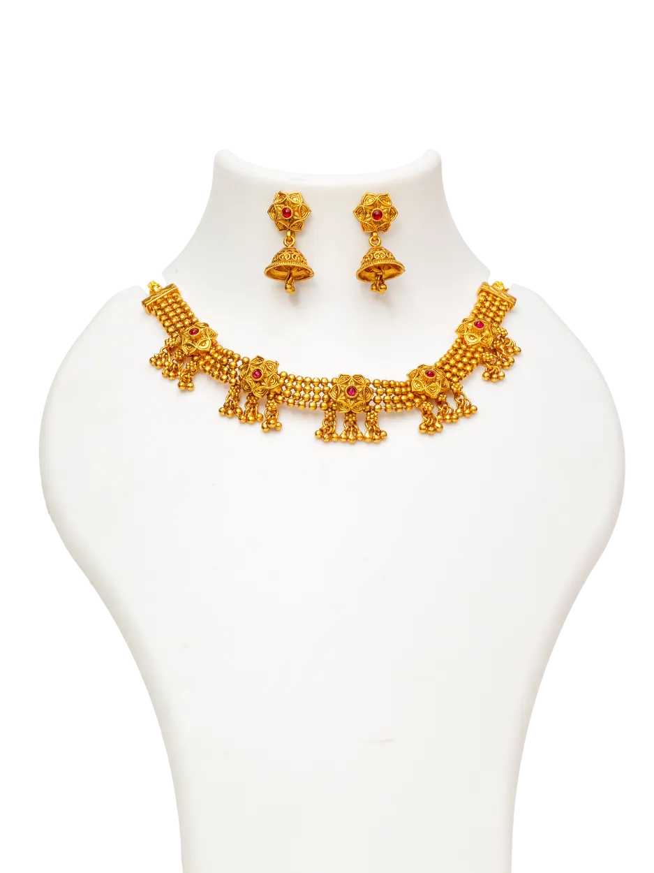 The necklace features intricate floral motifs highlighted with small red stone accents, giving it a traditional and elegant touch. Delicate hanging bead elements add movement and enhance the overall richness of the design. The detailed craftsmanship gives the piece a festive and royal appearance.