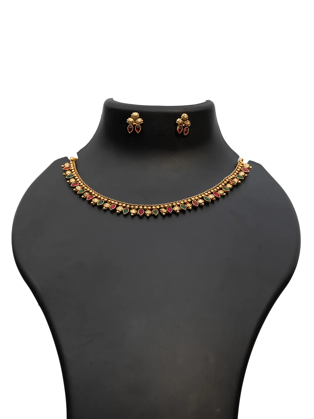 This traditional stone studded short necklace set showcases a refined and elegant design suited for timeless ethnic styling. The necklace features a slim gold-finish base embellished with neatly arranged pink and green stone accents, offering a rich yet balanced color contrast.